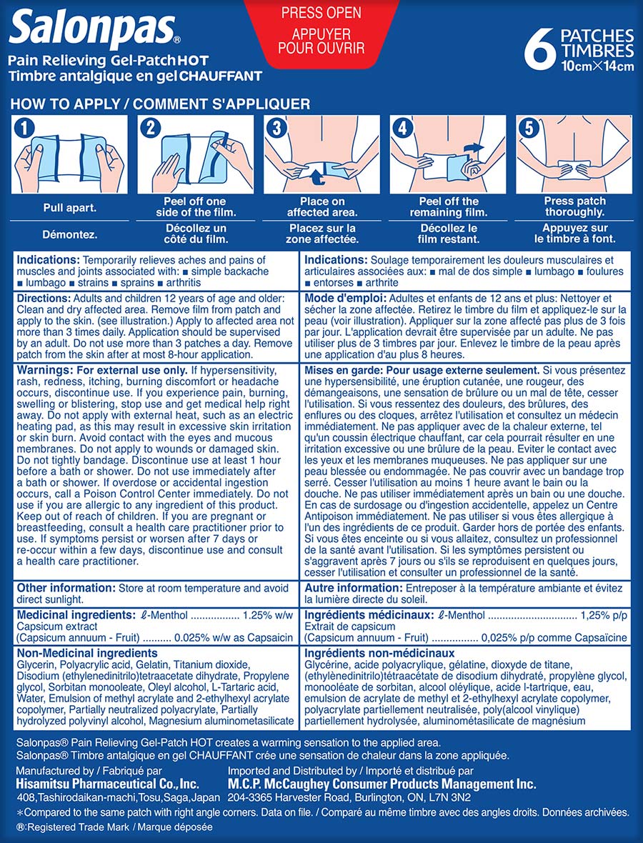Le timbre antalgique en gel chauffant Salonpas contient deux puissants ingrédients antidouleur. Le menthol crée une sensation rafraîchissante et apaisante et la capsaïcine procure un soulagement durable et réchauffant. La combinaison procure jusqu'à huit heures de soulagement ciblé. Les coins arrondis empêchent le décollage et la pellicule scindée au centre permet l'application facile du timbre.