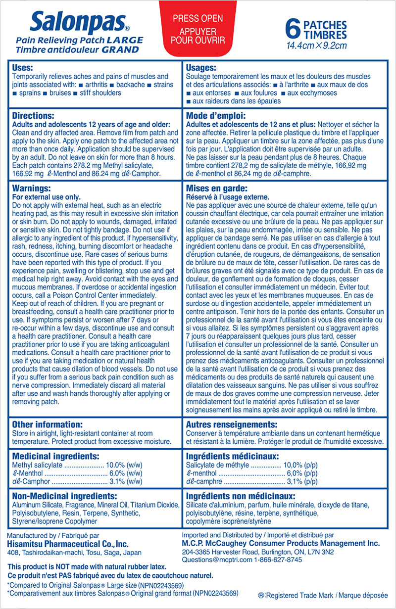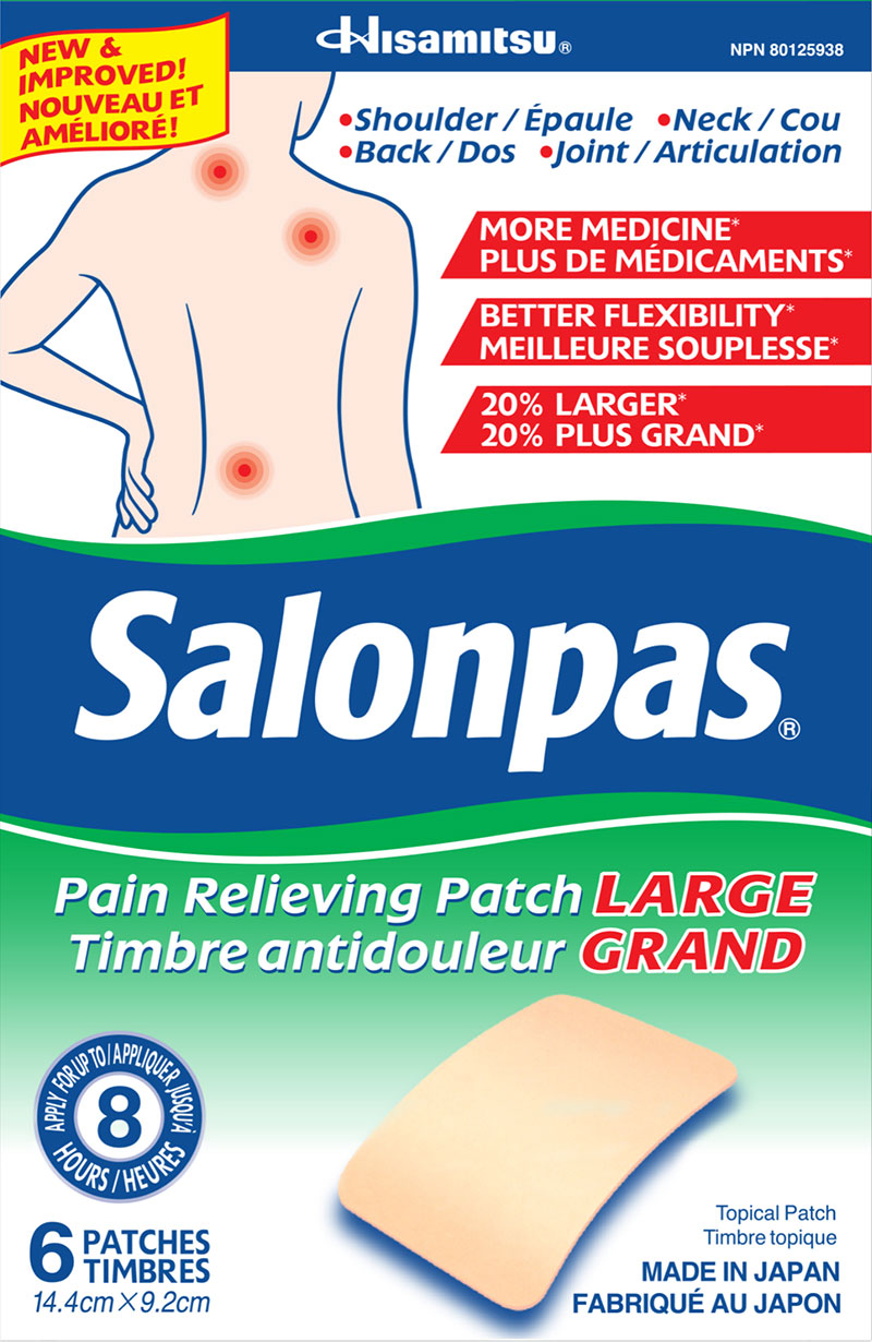 Le timbre analgésique Salonpas contient maintenant plus de médicaments contre la douleur dans chaque timbre, en plus d’être 20 % plus grands et d’avoir une meilleure flexibilité. Le timbre présente également une meilleure adhérence, avec des coins arrondis qui résistent au décollement.